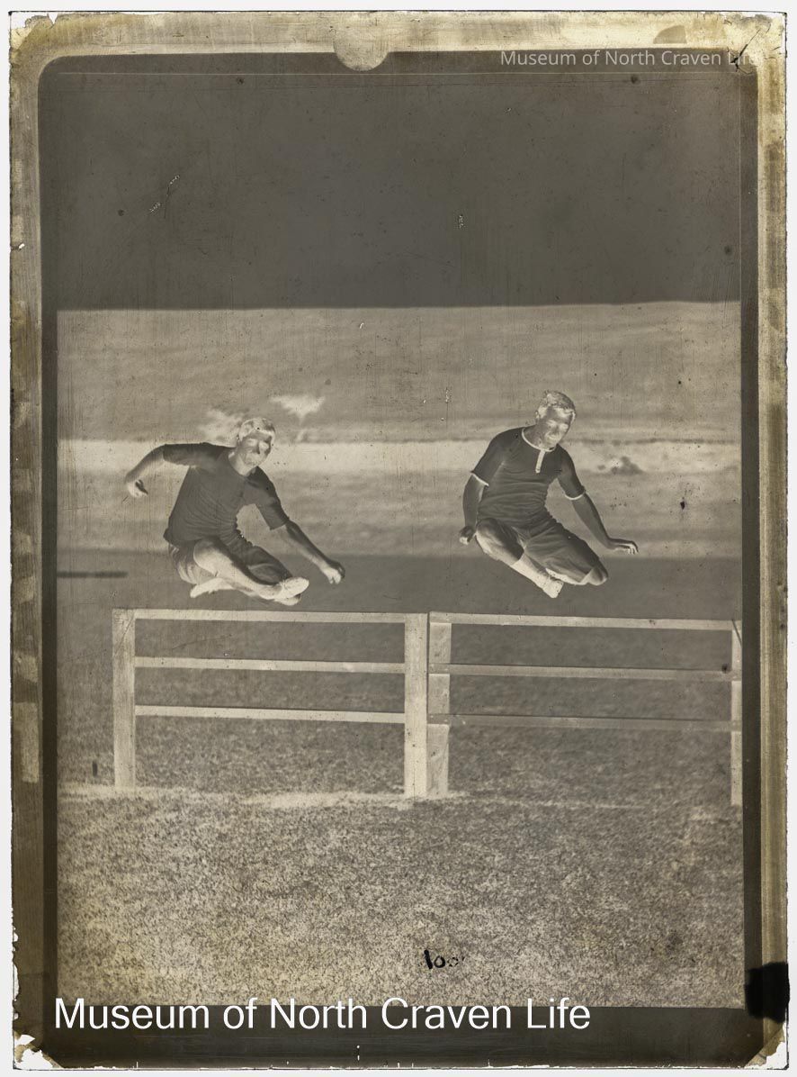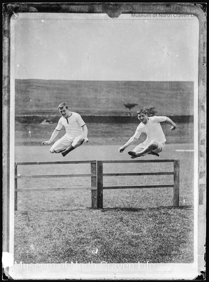 A half-plate gelatin silver glass negative. Two men in sporting whites are jumping over wooden hurdlesCollection