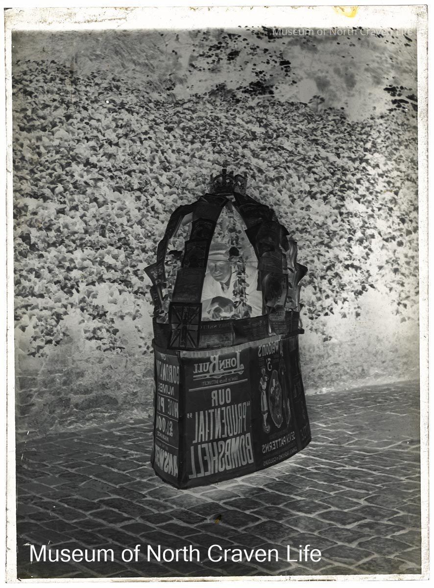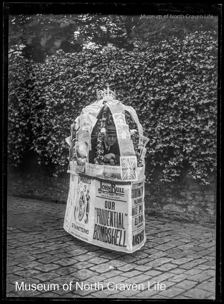 A half-plate gelatin silver glass negative. A portrait of a man with novelty coronation news stand covered with decorative bunting and advertising hoardingsCollection