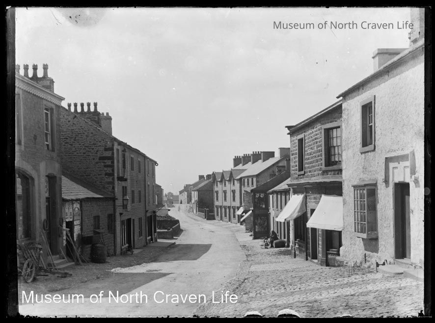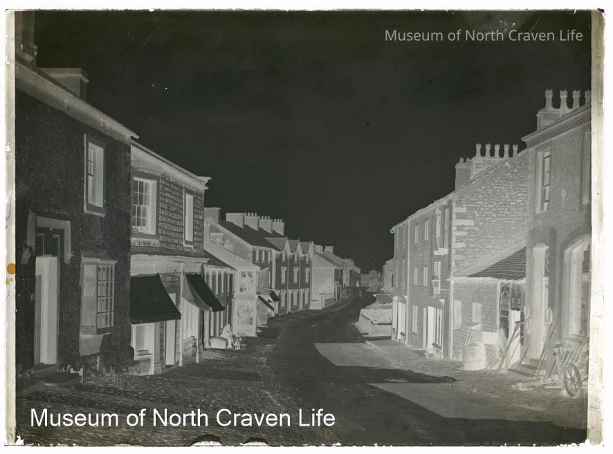 A half-plate gelatin silver glass negative. A view of the main street of the village of Bentham, North Yorkshire. A man sits on a beer barrel on the right facing two children. Agricultural implements are placed against a wall opposite the man with advertising posters on the wallCollection