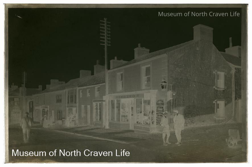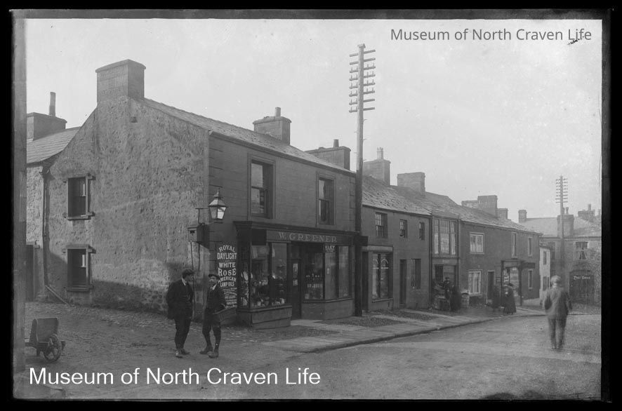 A half-plate gelatin silver glass negative. A view of the main street of the village of Bentham, North Yorkshire. W. Greenep, an ironmonger's shop stands to the left with an advertisement for "Royal Daylight and White Rose American Lamp Oils" on the wall. Several people are present in the streetCollection