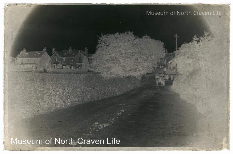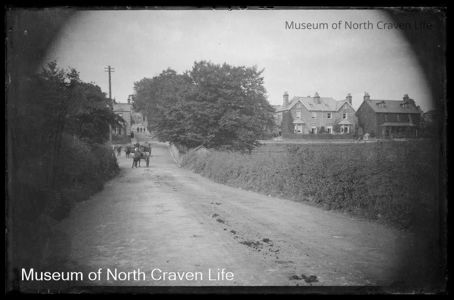 A half-plate gelatin silver glass negative. A view of the main street of the village of Bentham, North Yorkshire. A number of people are walking in the road. Three men each with horse and cart occupy the centre ground. Trees line the road on either sideCollection