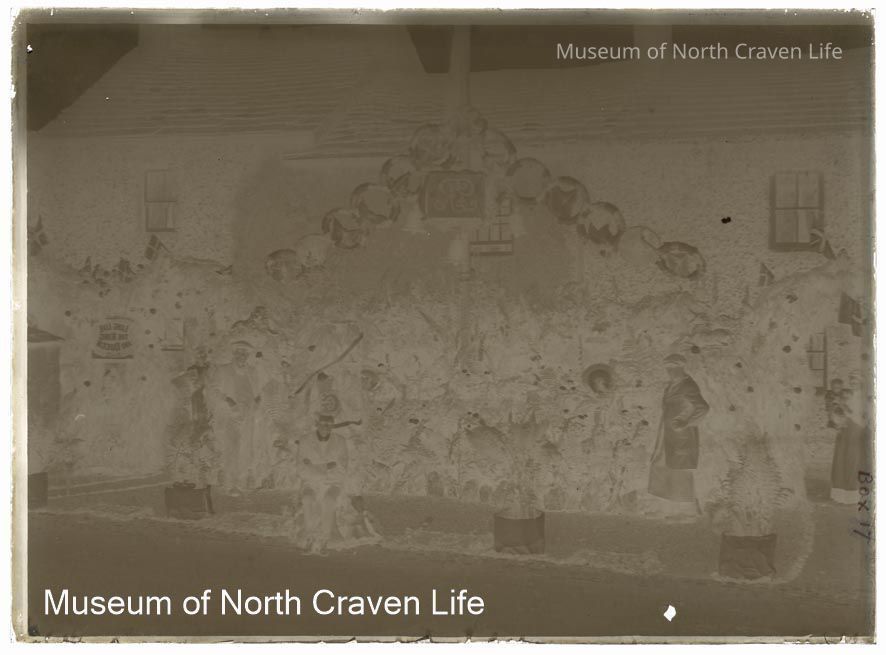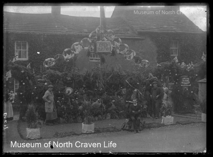 A half-plate gelatin silver glass negative. A view of a decorative floral structure erected in honour of the King and Queen (George V ?) in Giggleswick. A panel in the centre of the display bears the initials "GR"; a second panel to the rights states "Long live the King and Queen". People stand beside and in front of the towerCollection