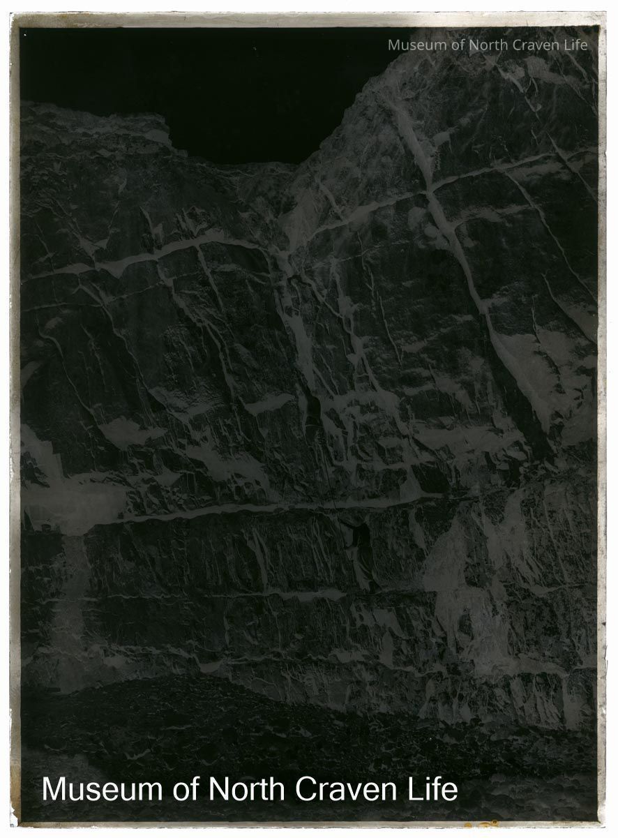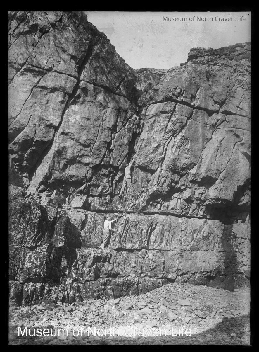 A half-plate gelatin silver glass negative. A view of two climbers with ropes ascending the Waterfall climb in Hull PotCollection