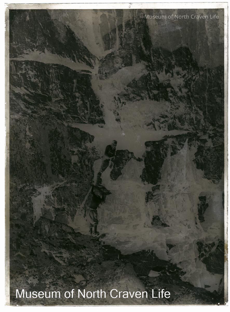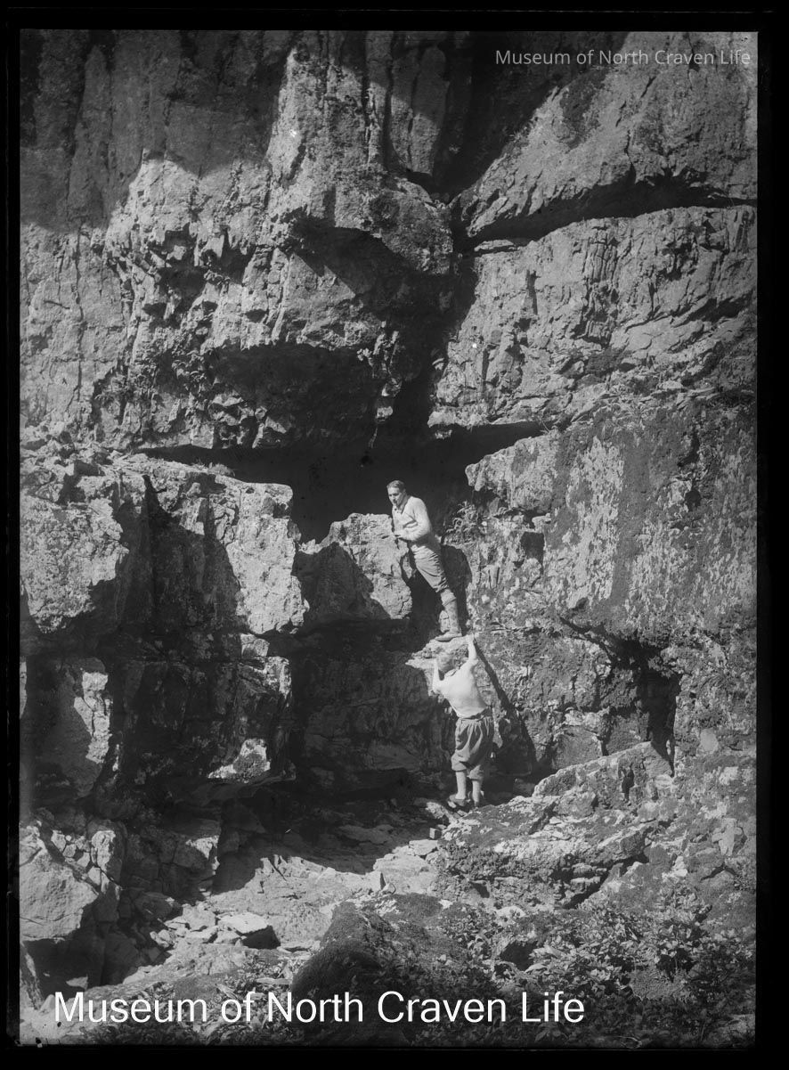 A half-plate gelatin silver glass negative. A view of two climbers at the cave entrance in Hull PotCollection