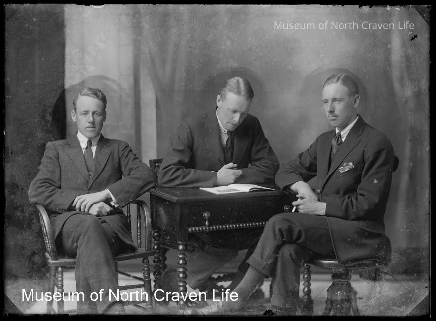 A half-plate gelatin silver glass negative. A portrait of three men seated at a small table. One of them is leaning on the table, reading an open bookCollection