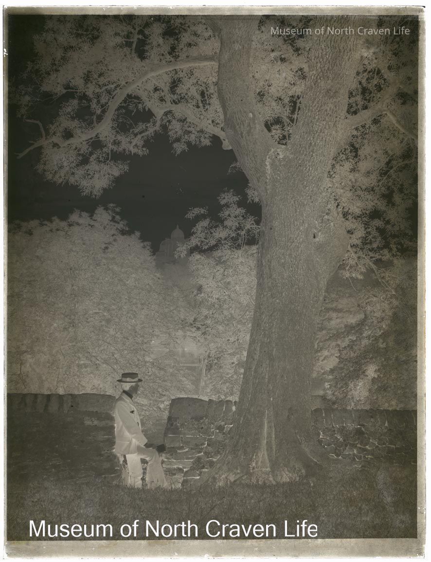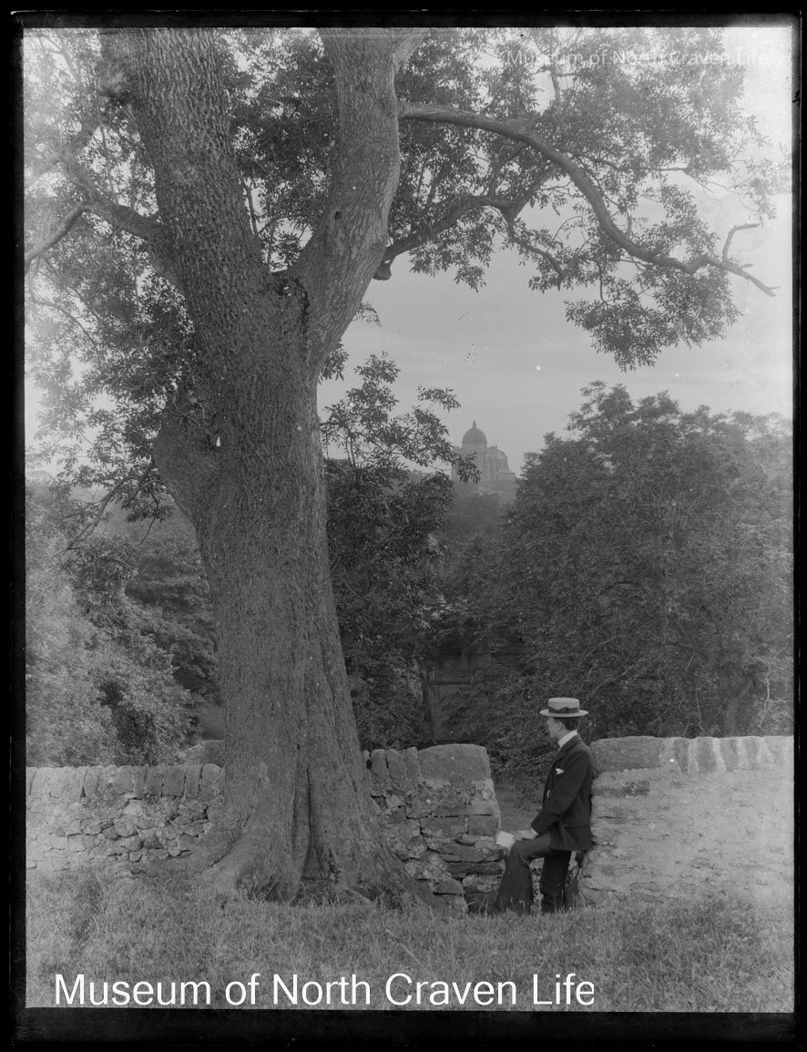 A full-plate gelatin silver glass negative. A view of Giggleswick School Chapel in the distance. A young man stands in the gap of the wall in profile, to the right of a large tree. He wears trousers and jacket with a straw hat.Collection