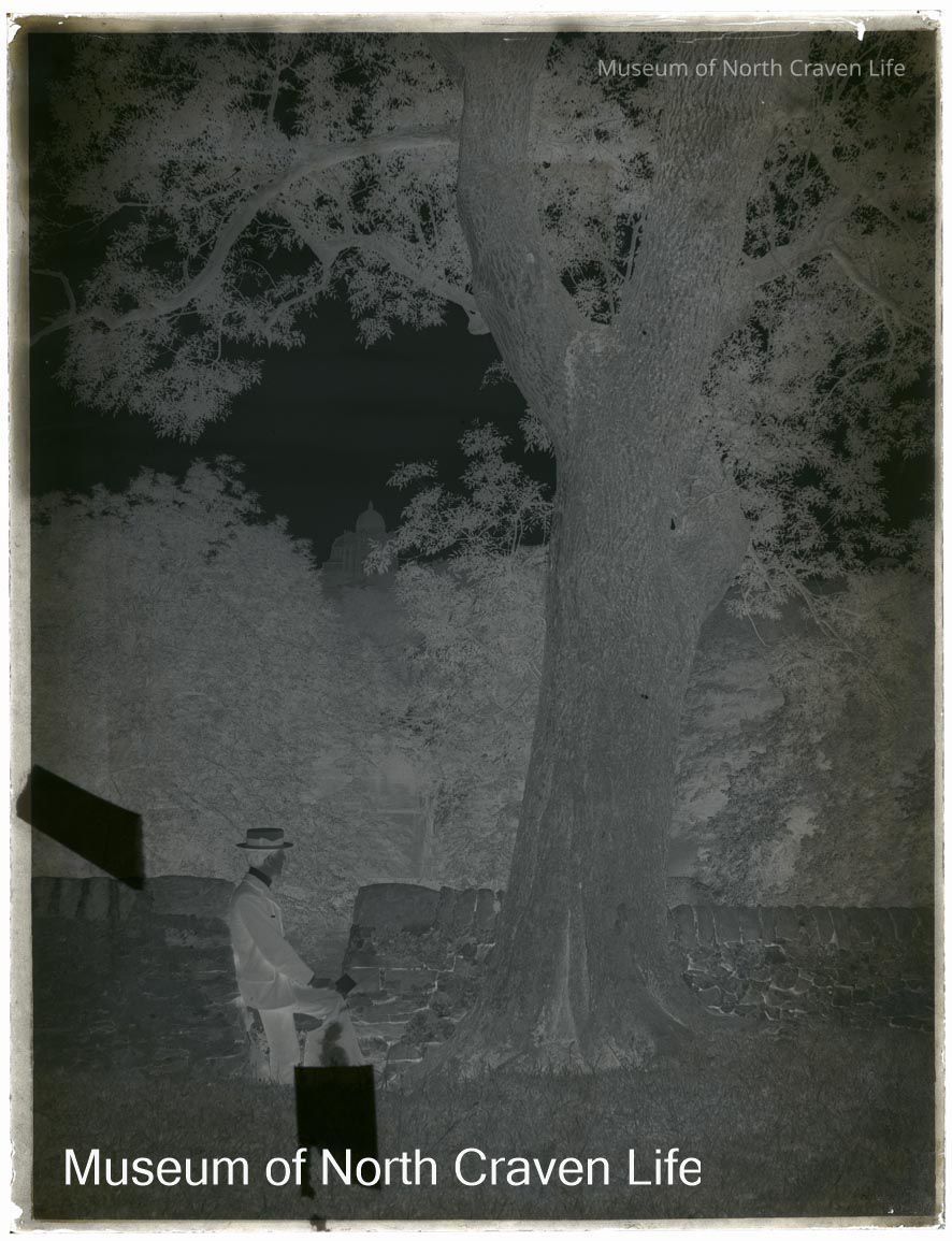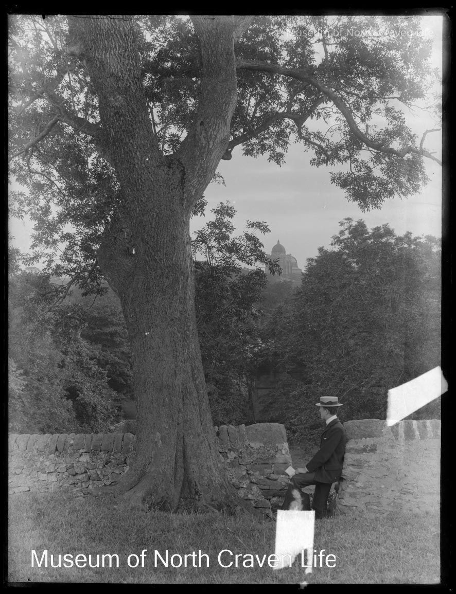 A full-plate gelatin silver glass negative. A view of Giggleswick School Chapel in the distance. A young man stands in the gap of the wall in profile, to the right of a large tree. He wears trousers and jacket with a straw hat. White rectangular marks on the bottom right corner of the image near the man and the wall.Collection