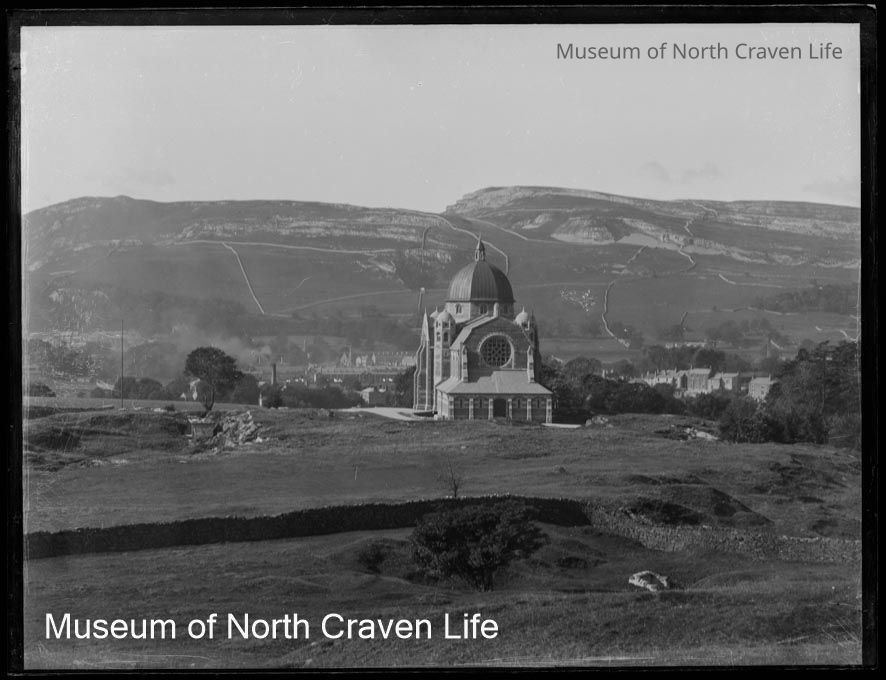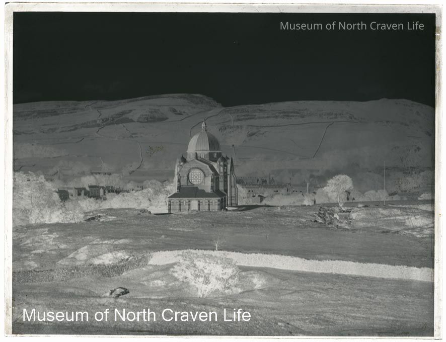 A full-plate gelatin silver glass negative. A view of Giggleswick School Chapel across open fields. A dry stone wall stretches across the view in the middle groundCollection