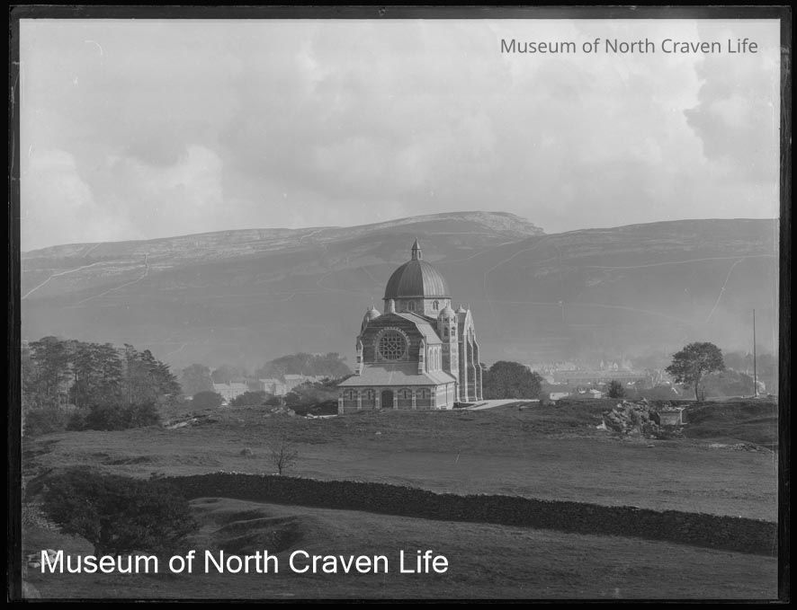 A full-plate gelatin silver glass negative. A view of Giggleswick School Chapel from the Cricket Field. A dry stone wall stretches across the view in the foregroundCollection