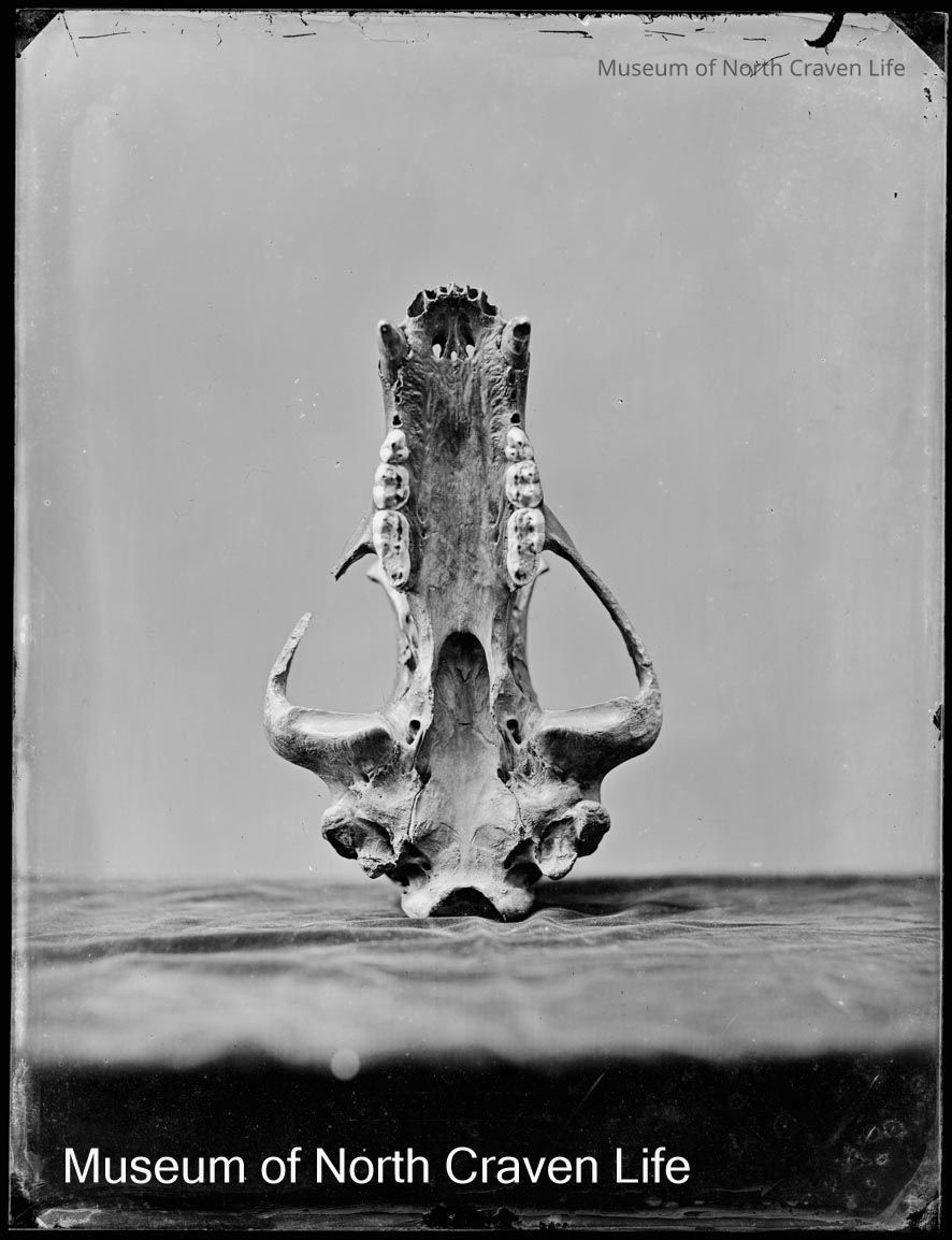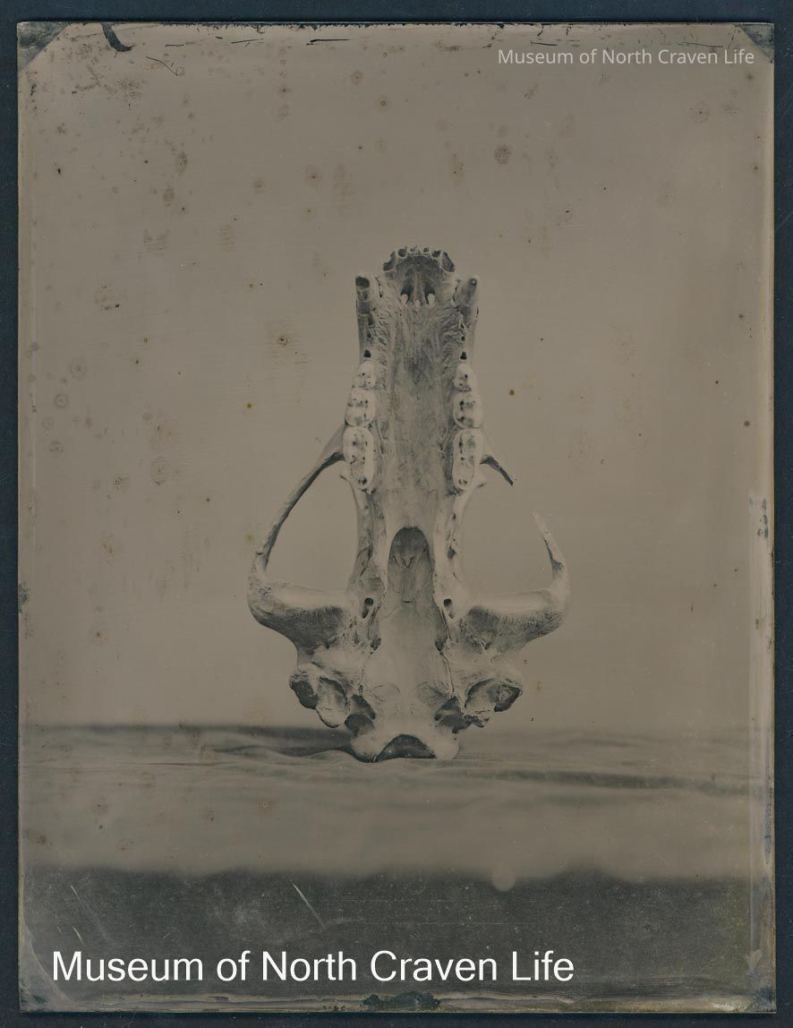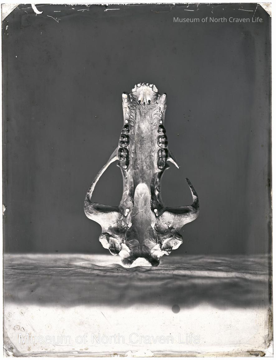 A full-plate gelatin silver glass negative. A view of a brown bear skull recovered from Victoria CaveCollection