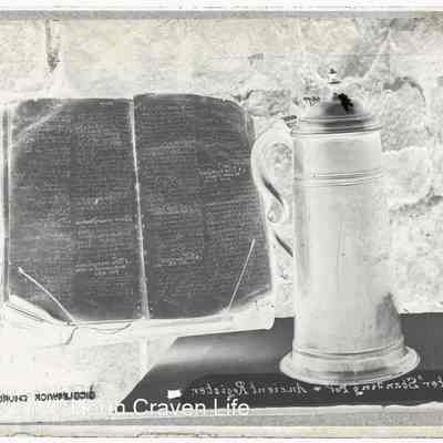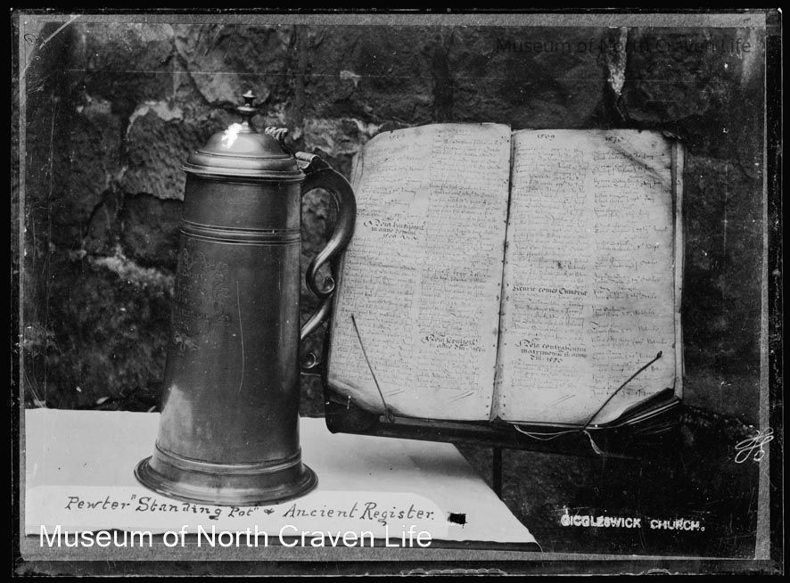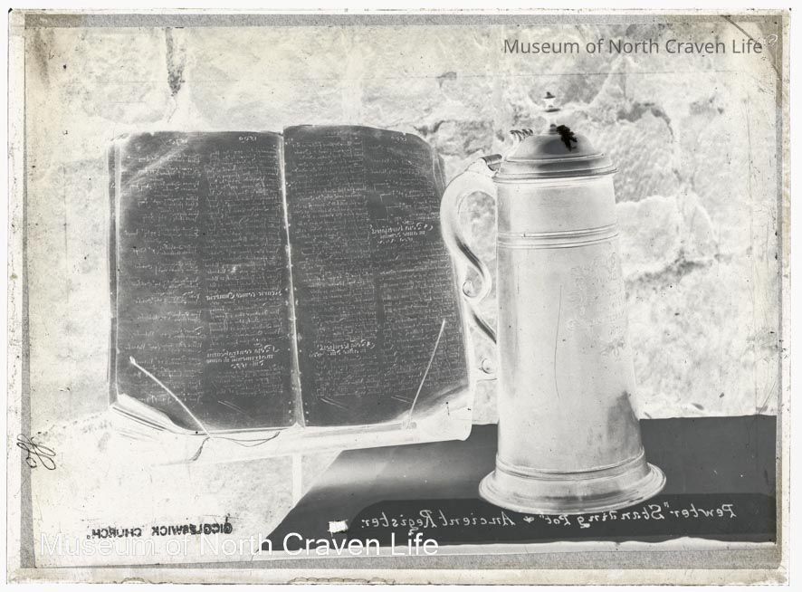 A half-plate gelatin silver glass negative. A view of a pewter standing pot and an Ancient Register from Giggleswick Church (St Alkelda's)Collection