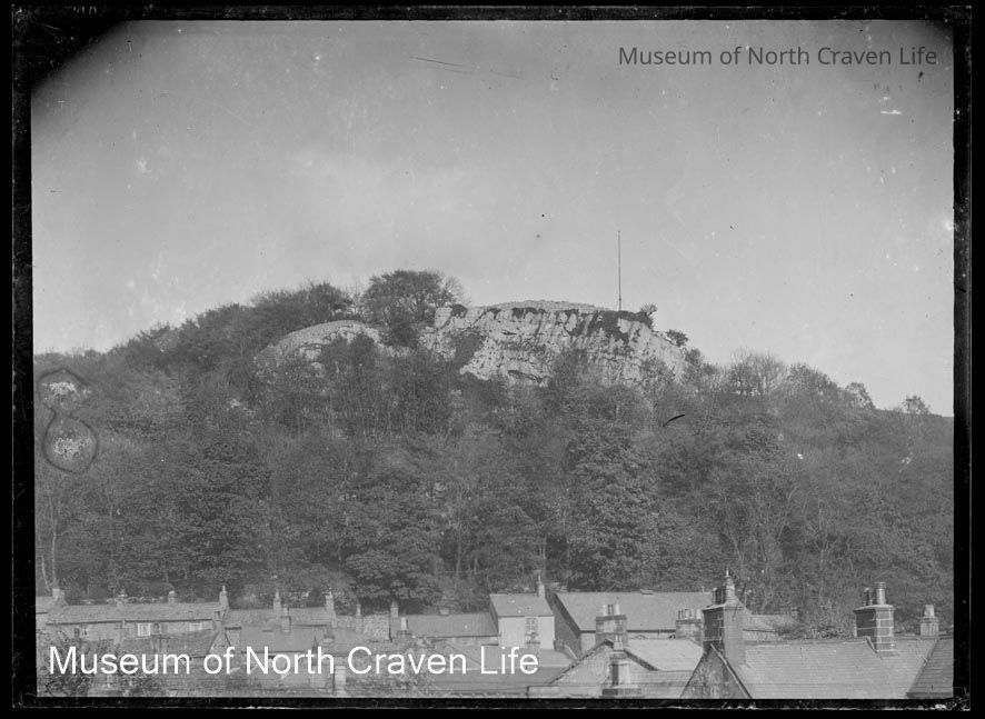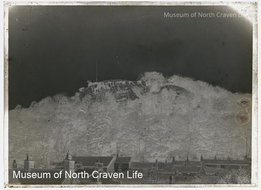 A half-plate gelatin silver glass negative. A view of Castleberg from below in SettleCollection