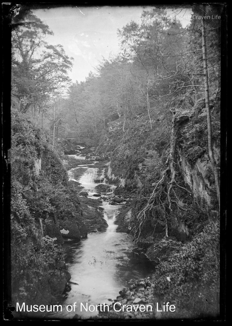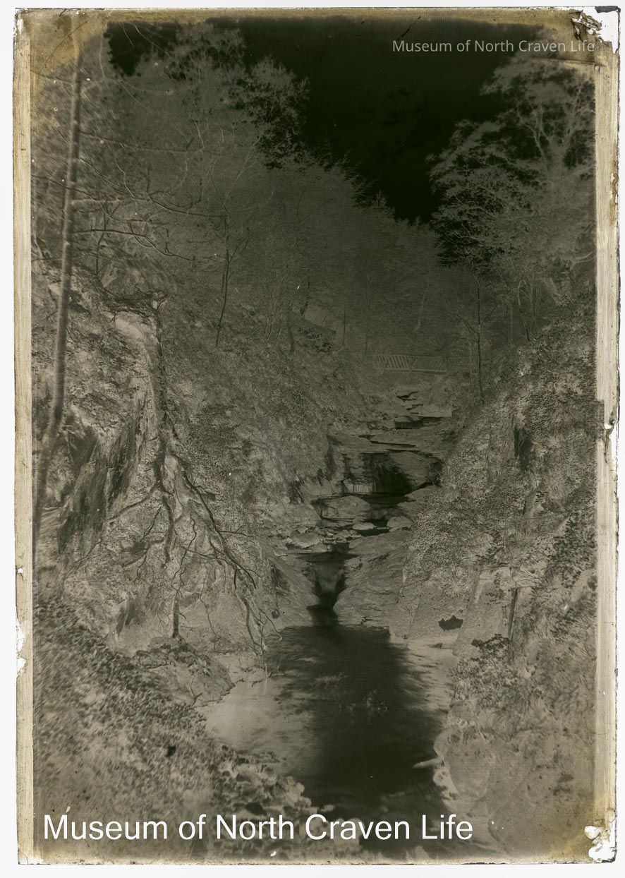 A half-plate gelatin silver glass negative. A river flows through a steep sided valley lined with trees. In the distance there is a wooden bridge.Collection