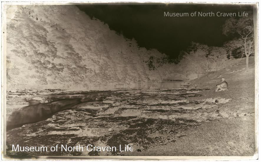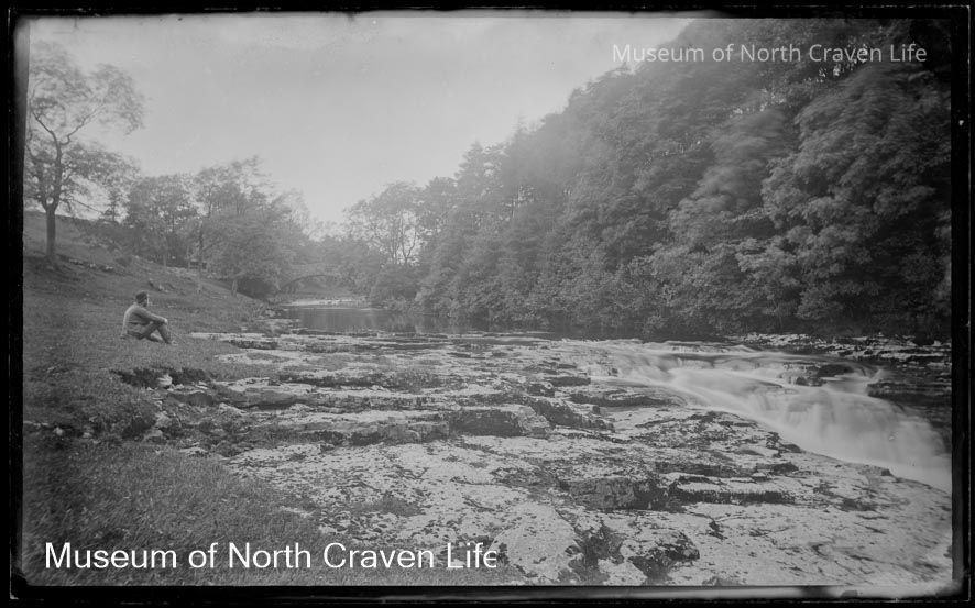 A half-plate gelatin silver glass negative. A view of Stainforth Foss river and bridge. A man is seated on the bank of the riverCollection