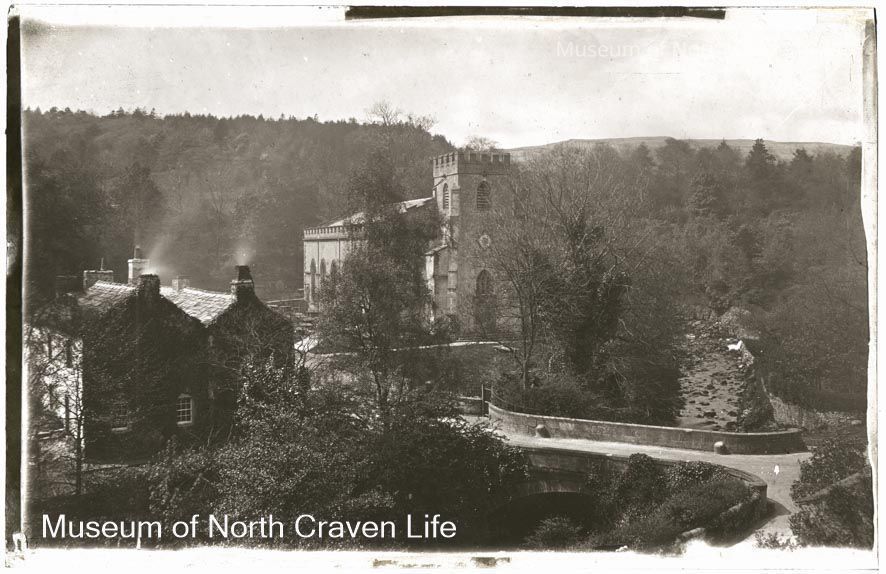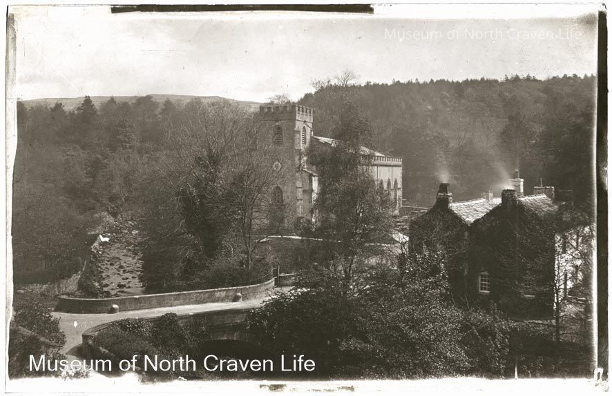 A half-plate gelatin silver glass positive. A view of St James's Church in Clapham. "St James' church is a Grade II listed building. It was largely rebuilt in 1814 (and has some c.1900 alterations), but retains its 15th century tower. The ends of the Jacobean pews have been used as paneling around the walls. This was probably done c.1900 as that is when the current pews date from. The church was rebuilt by the Farrar family of Ingleborough Hall, to whom there are several memorials to in the church." (https://yorkshirechurchyards.wordpress.com/clapham-st-james-church). A positive image, copied from a negative, therefore the image is reversed.Collection