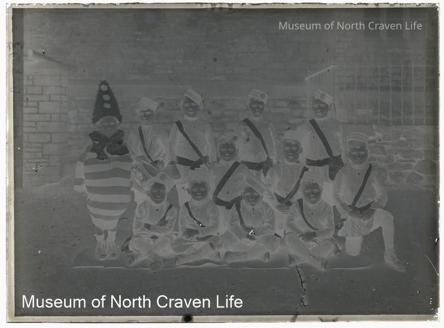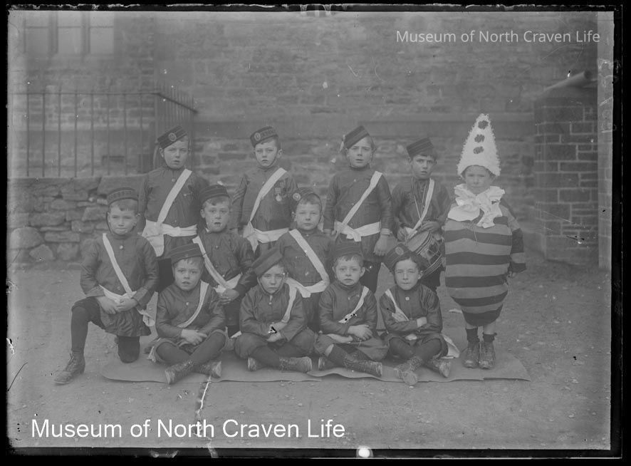 A half-plate gelatin silver glass negative. A portrait of 12 boys in uniform, standing and sitting in front of a railing. One of the boys is wearing a costume. Taken possibly outside Settle Primary SchoolCollection