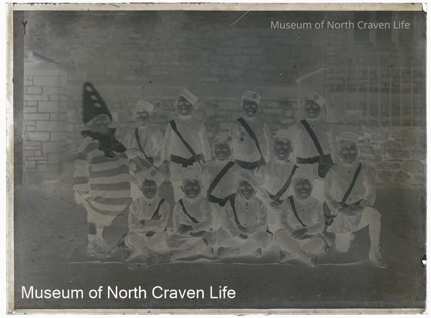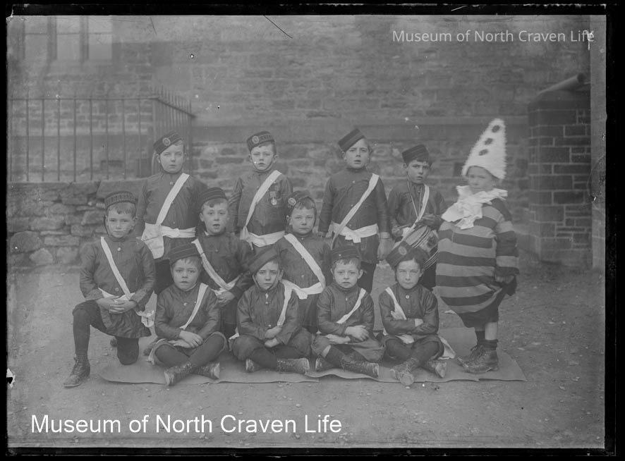 A half-plate gelatin silver glass negative. A portrait of 12 boys in uniform, standing and sitting in front of a railing. One of the boys is wearing a costume ; another holds a drum. Taken possibly outside Settle Primary SchoolCollection