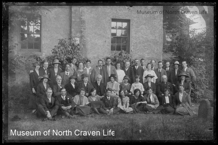 A half-plate gelatin silver glass negative. A group portrait of men and women seated and standing before a building. A gravestone appears in the foregroundCollection