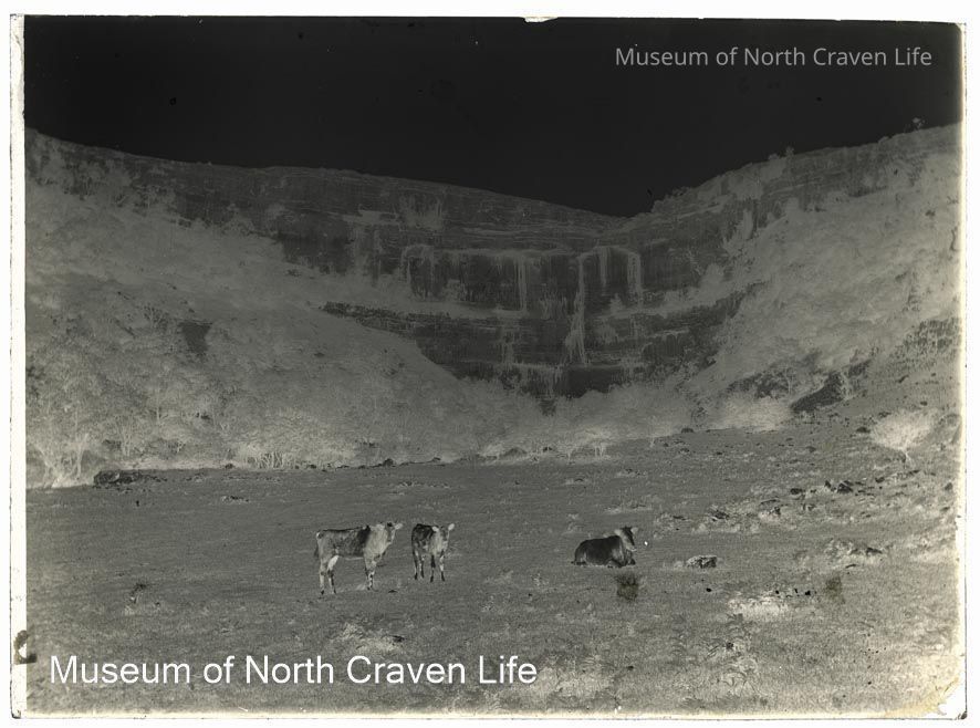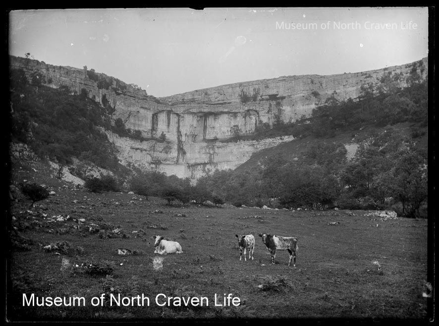 A half-plate gelatin silver glass negative. A view towards Malham Cove from the valley bottom. Cattle stand in the foregroundCollection
