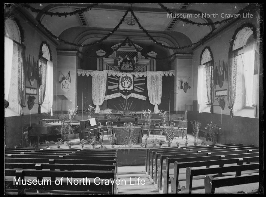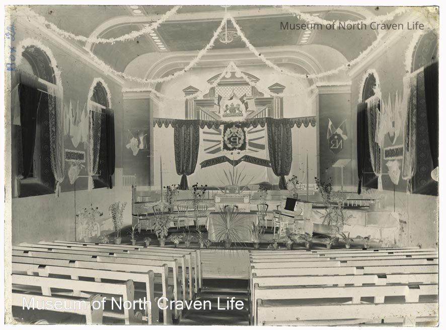 A half-plate gelatin silver glass negative. A view of the interior of Victoria Hall in Settle, looking towards the stage. The Hall is decorated with the Insignia of the Primrose League.Collection