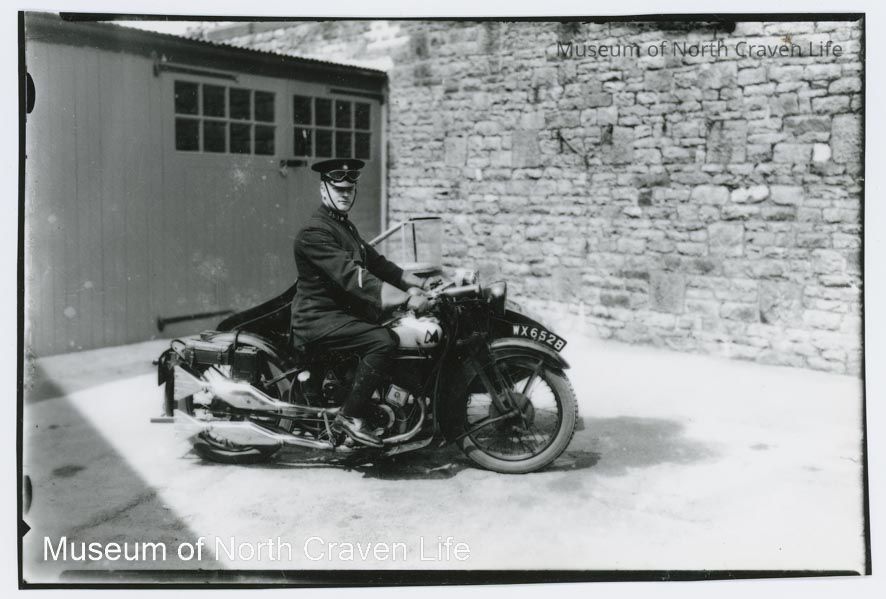 A gelatin silver print. A portrait of a uniformed police officer, posing on police motorcycle with sidecarCollection