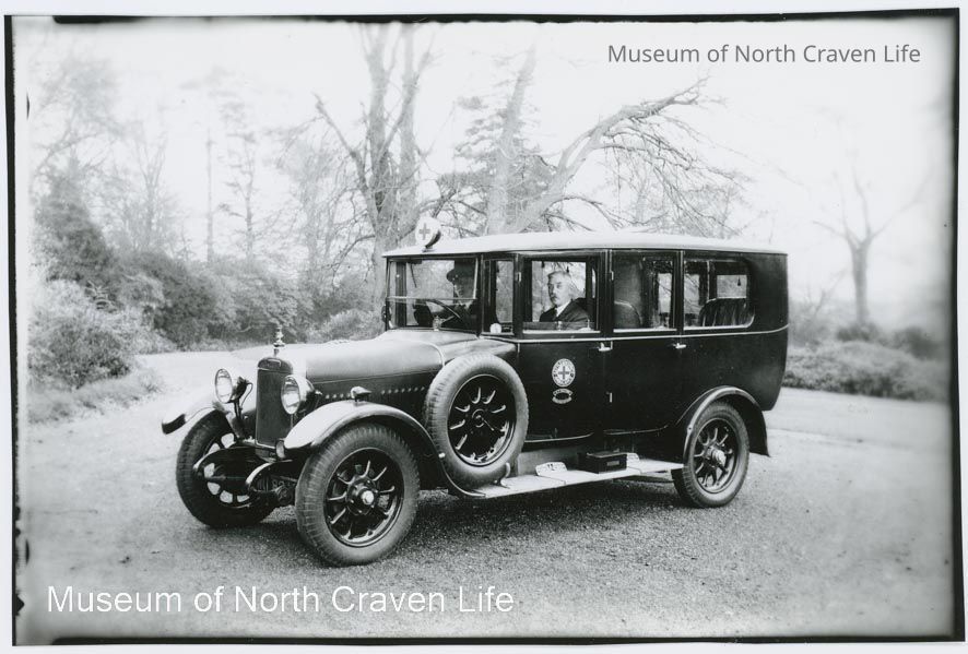 A gelatin silver photographic print. A view of a Settle & District ambulance parked on a driveway. A uniformed driver and a passenger are seated in the vehicleCollection