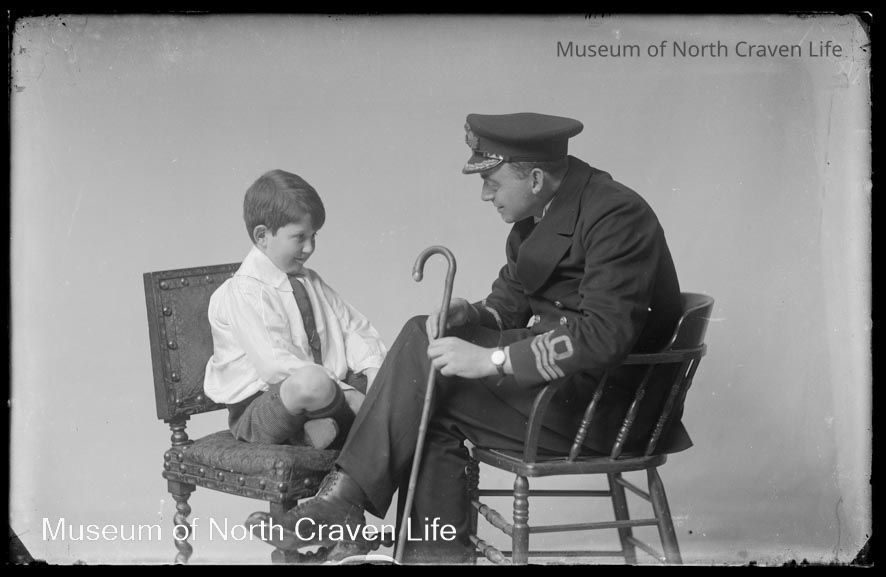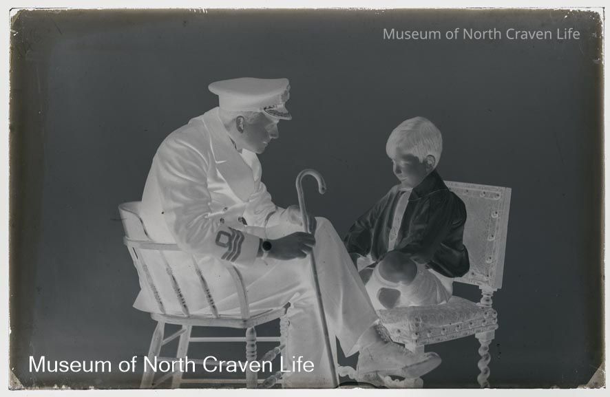 A half-plate gelatin silver glass negative. A portrait of a man in naval uniform with a small boy ; both are seated and the man holds a caneCollection