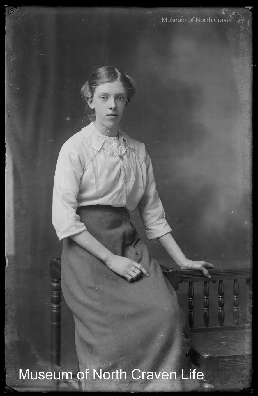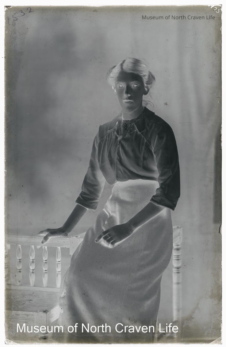 A half-plate gelatin silver glass negative. A three-quarter length studio portrait of a young woman, half-seatedCollection