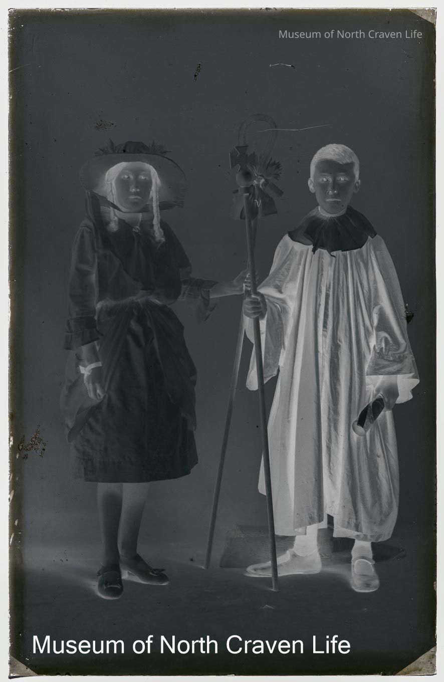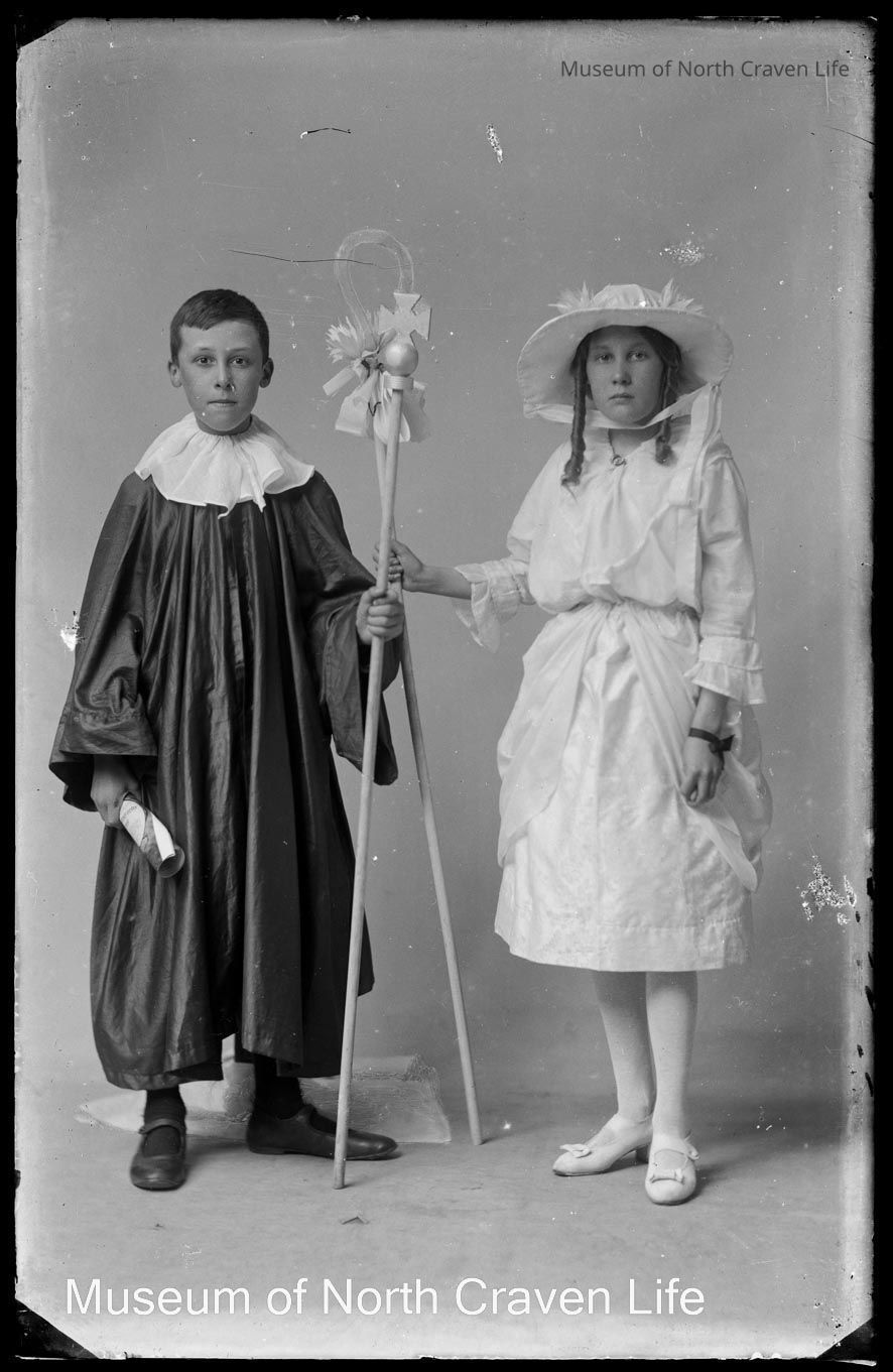 A half-plate gelatin silver glass negative. A portrait of two children in fancy dress. A boy is dressed as a choirboy and a girl is dressed as 'Little Bo-beep' shepherdess. They both hold decorated standards ; the boy has a scroll in his right handCollection
