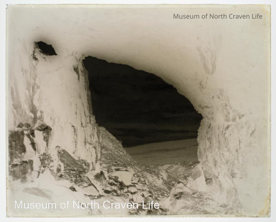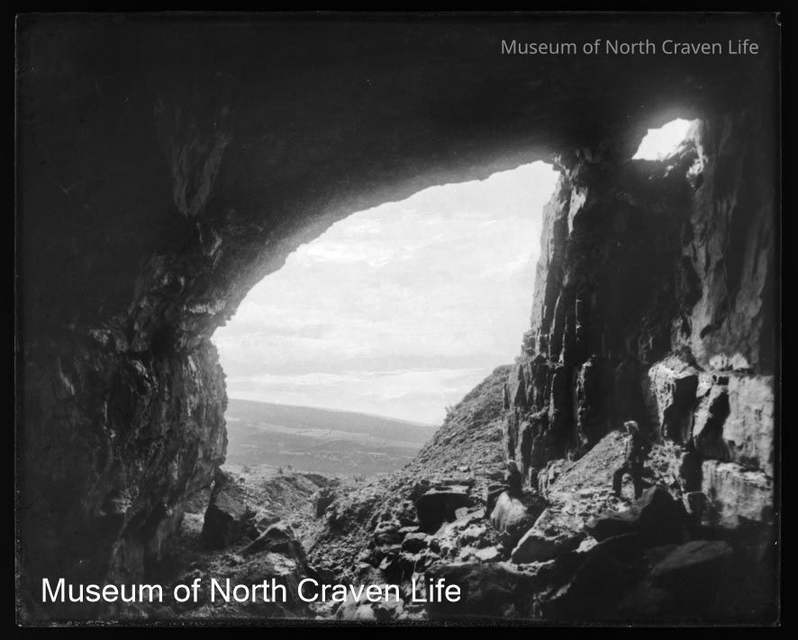 A gelatin silver glass negative. A view out from the entrance to Victoria Cave situated near Settle and to the east of Langcliffe in Ribblesdale. When excavated, the cave was found to contain the remains of mammoth, bear, elephants, reindeer, spotted hyena and hippopotamus as well as flint implements of which the earliest were 130,000 years oldCollection