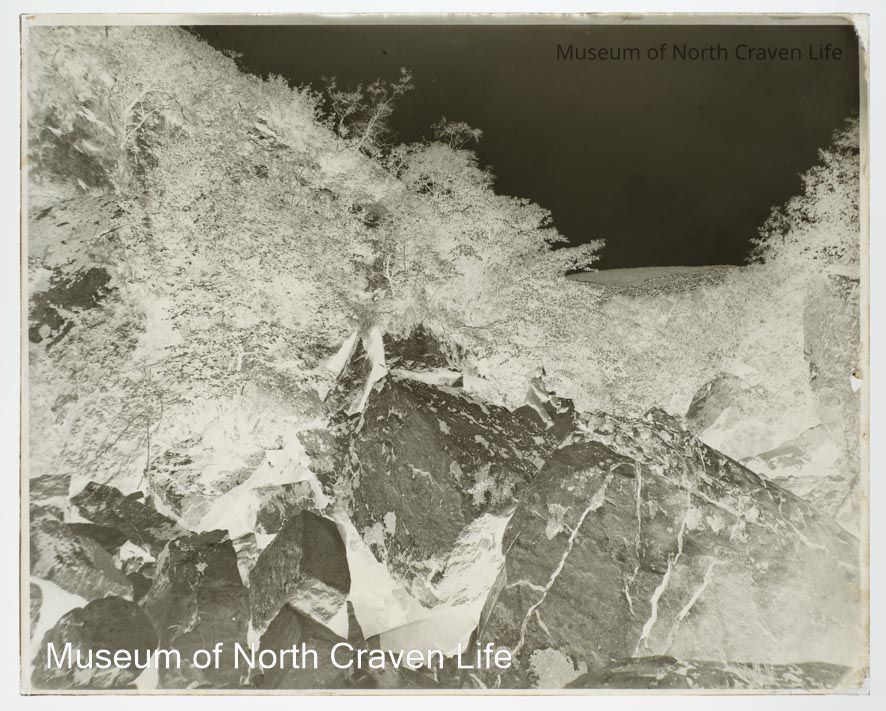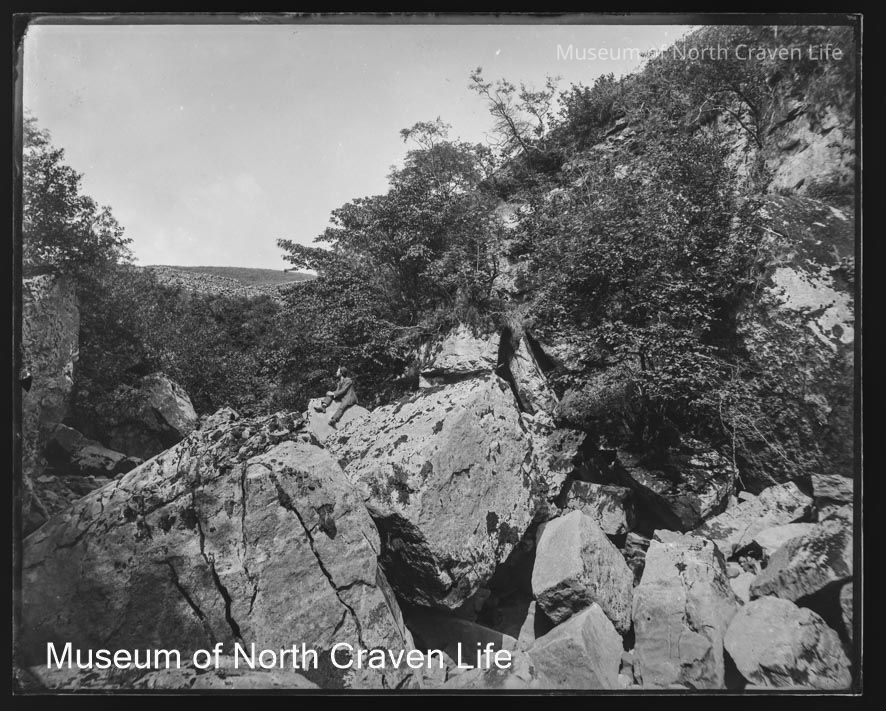 A gelatin silver glass negative. A view of a rocky landscape with a man seated on an outcrop. Above and behind him a dry stone walls runs across the hillsideCollection