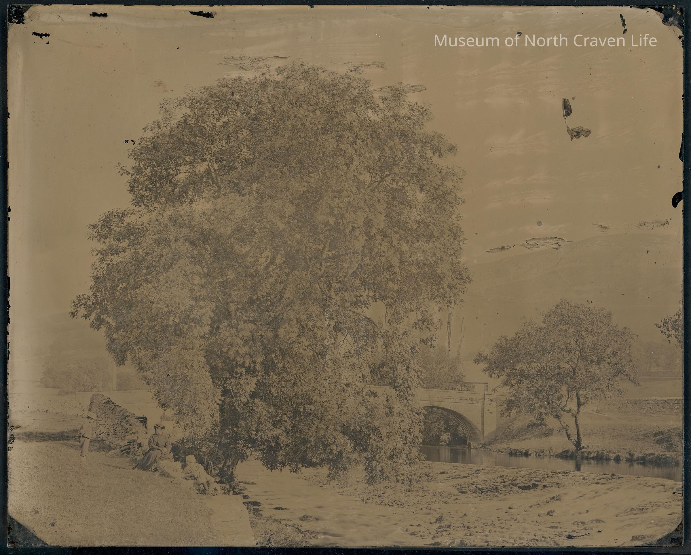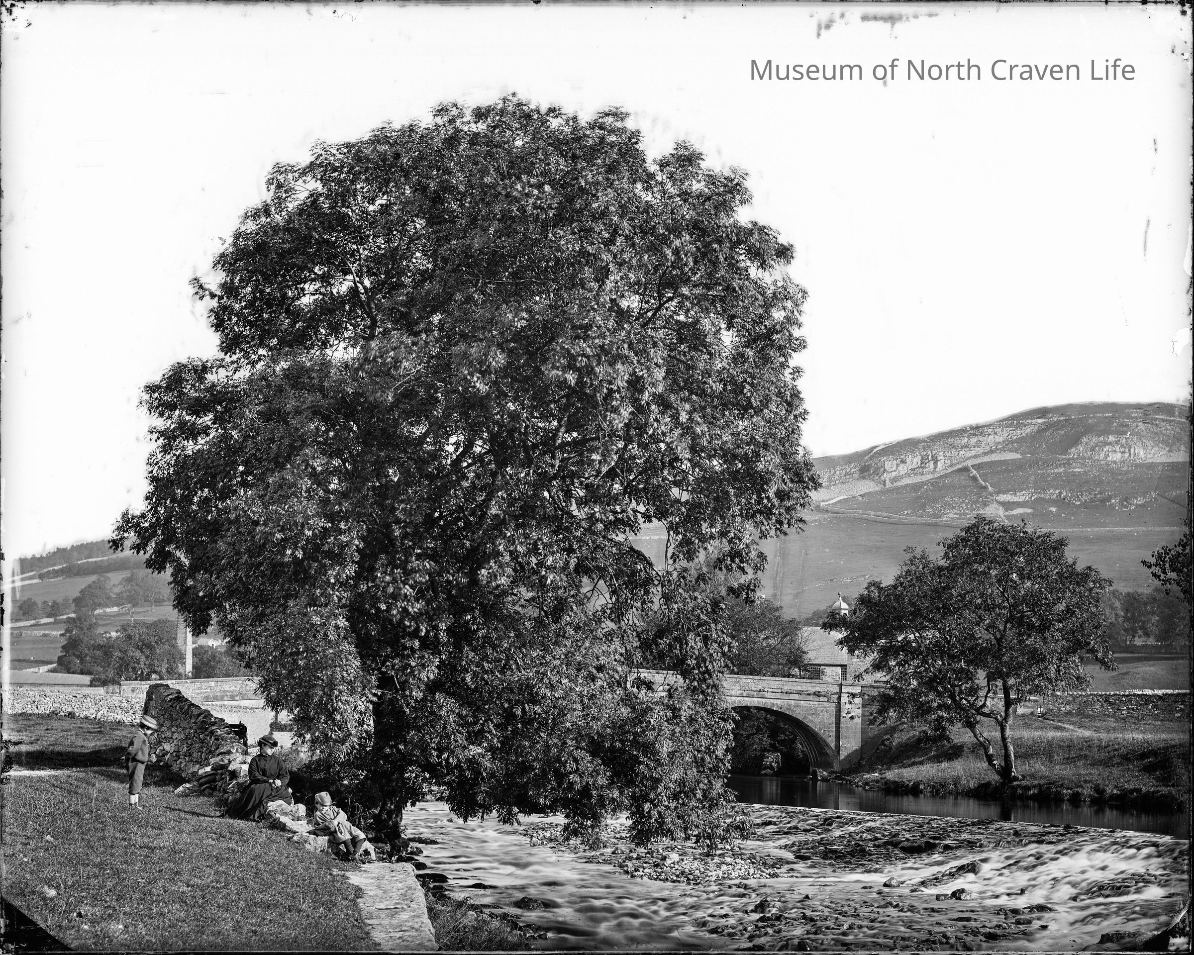 Woman with two children along the Ribble River near Main Street bridge, Settle.Made/Created