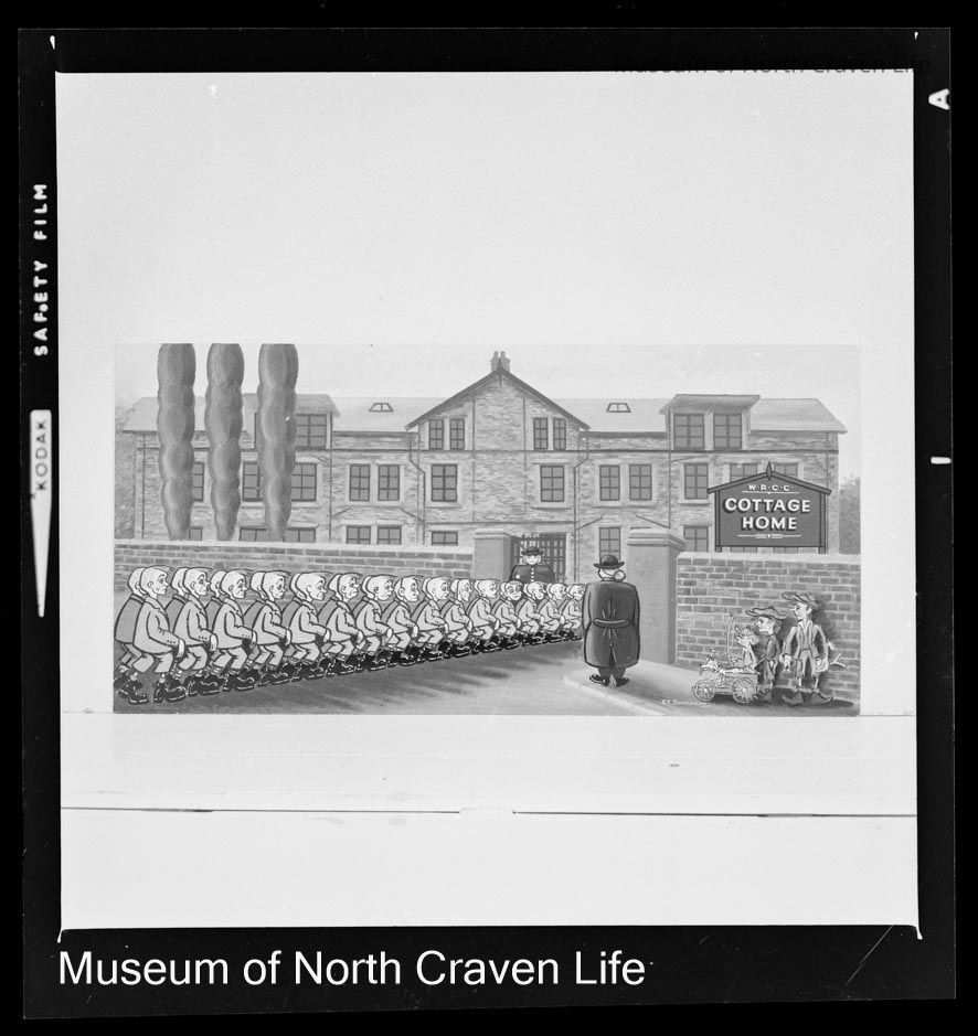 A 2½ x 2½" monochrome acetate film negative. An image of a cartoon signed S. R. Boardman of mill workers. The institution depicted is labelled W.R.C.C. COTTAGE HOMECollection