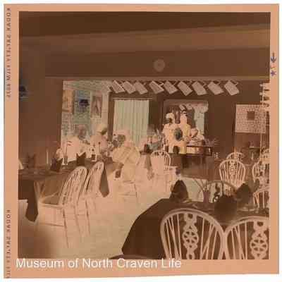 A 2¼" colour film negative. A group of five people with a waitress in a dining room in the Clapham New InnCollection