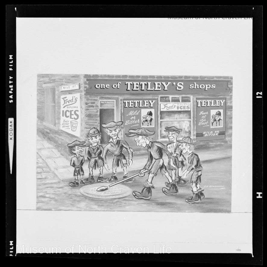 A 2½ x 2½" monochrome acetate film negative. An image of a cartoon signed S. R. Boardman of mill workers. A group of boys are playing in the streetCollection