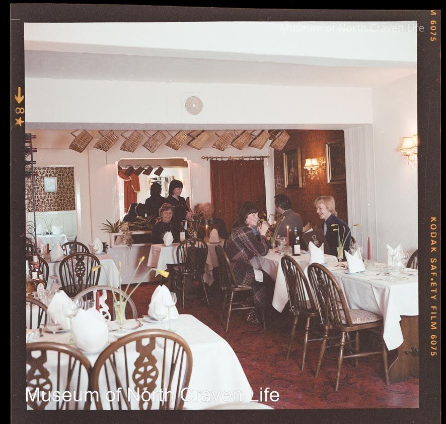 A 2¼" colour film negative. A group of five people with a waitress in a dining room in the Clapham New InnCollection