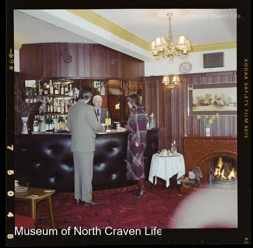 A 2¼" colour film negative. A group of three people stand at a bar in the Clapham New InnCollection