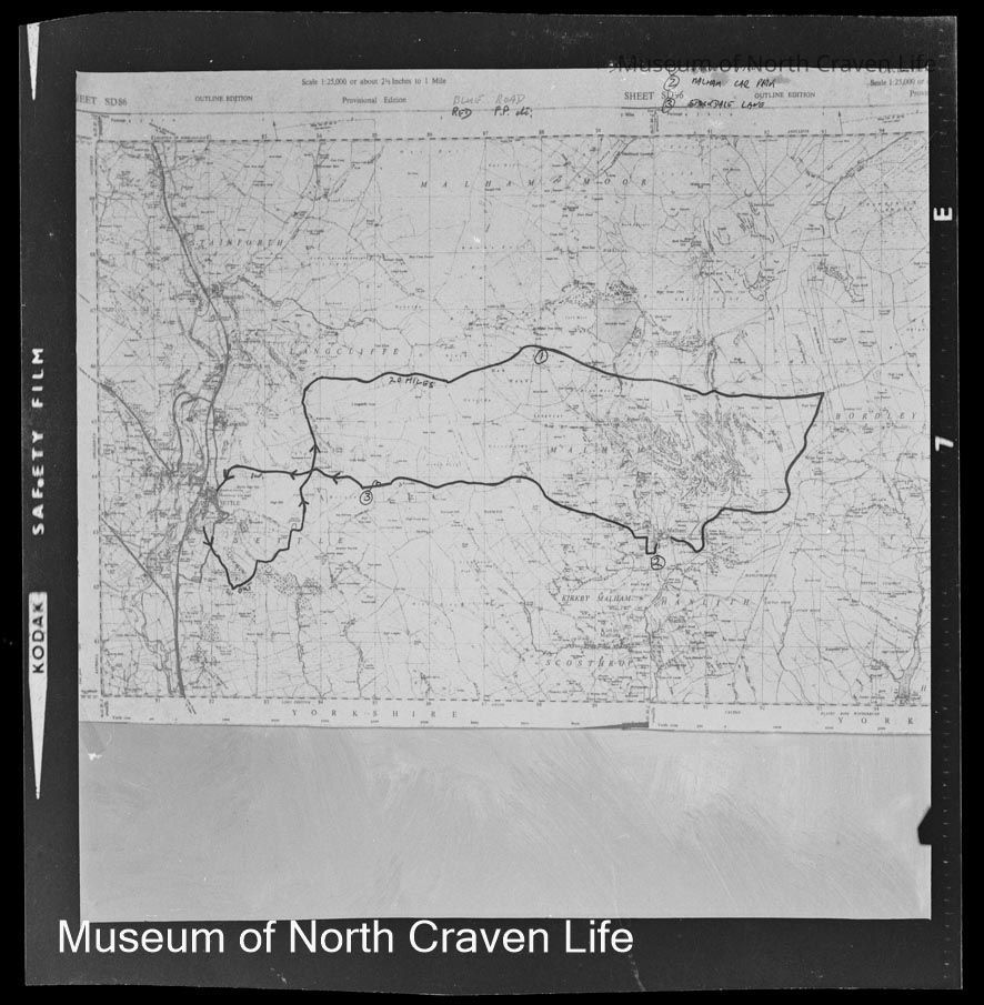 A 2½ x 2½" monochrome acetate film negative. A view of a map of the Langcliffe area on which is traced the route of a 20 mile walkCollection