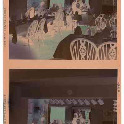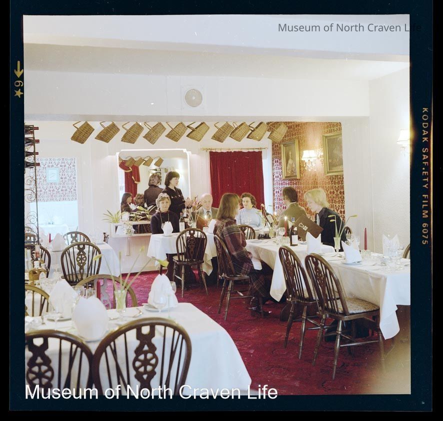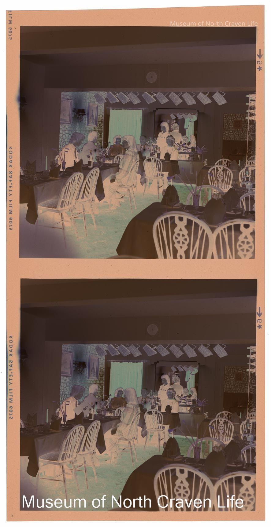 A 2¼" colour film negative. A group of six people with a waitress in a dining room in the Clapham New InnCollection