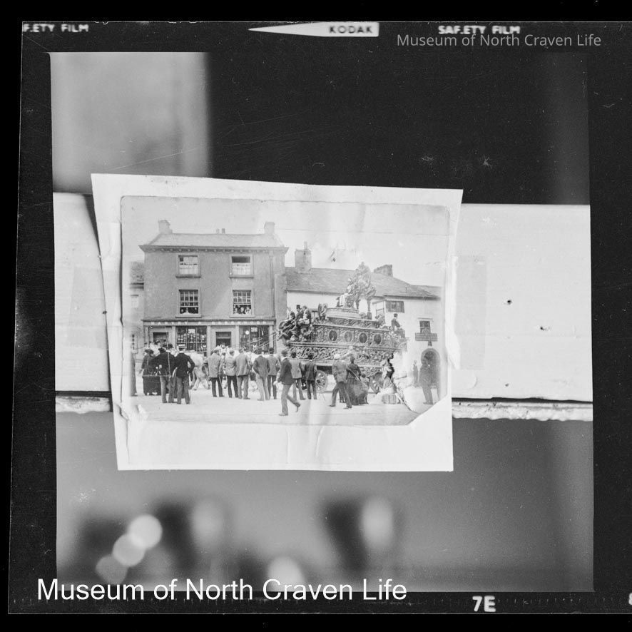 A 2½ x 2½" monochrome acetate film negative. A view of a procession : white horses draw an elaborate carriage upon which is seated a young woman ; the carriage passes along a street in front of commercial premises - Harvey & Greenwood. People look onCollection