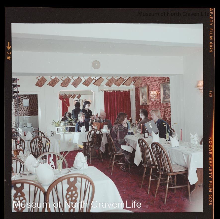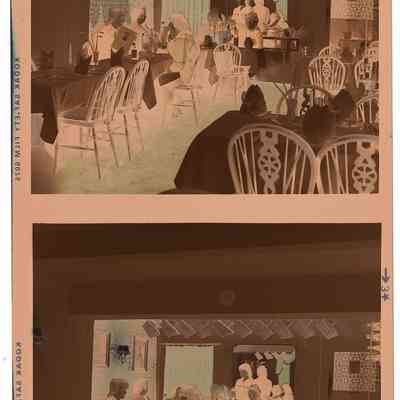 A 2¼" colour film negative. A group of six people with a waitress in a dining room in the Clapham New InnCollection