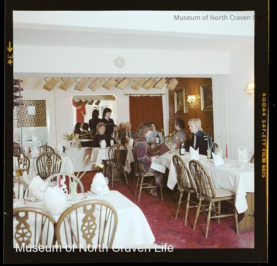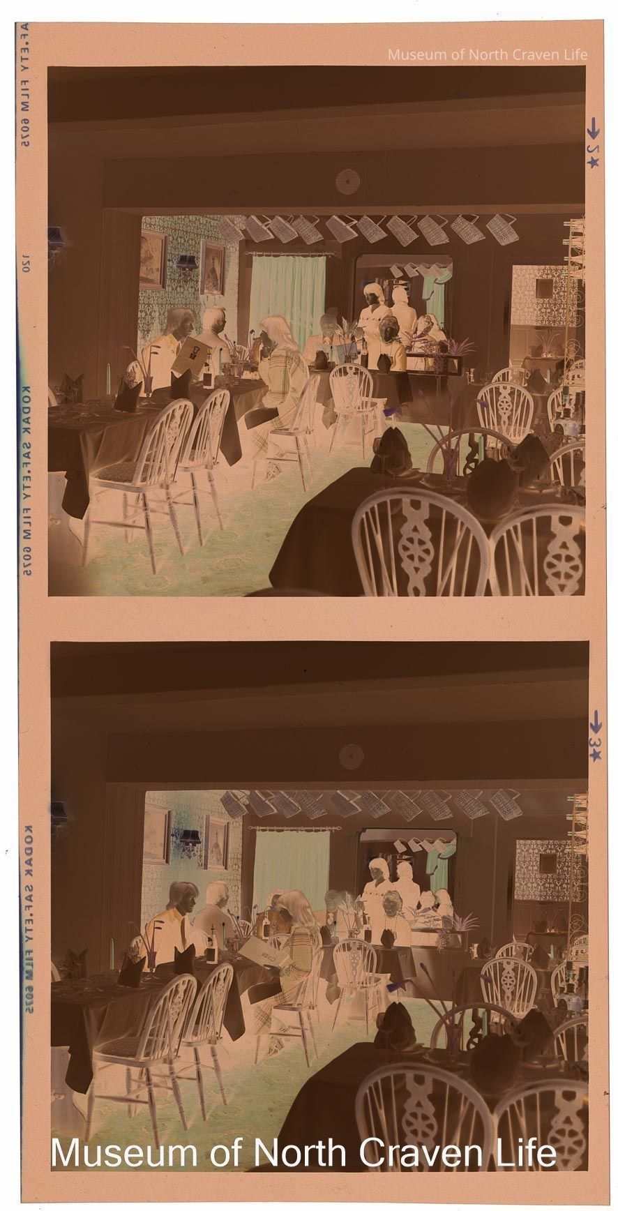 A 2¼" colour film negative. A group of six people with a waitress in a dining room in the Clapham New InnCollection