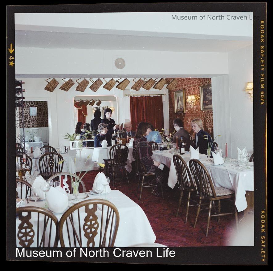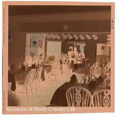 A 2¼" colour film negative. A group of six people with a waitress in a dining room in the Clapham New InnCollection