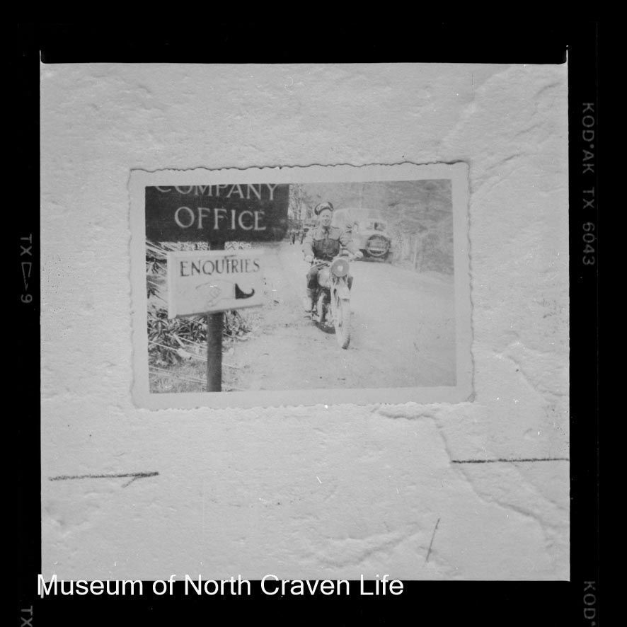 A 2½ x 2½" monochrome acetate film negative. A view of a man riding a motor cycle ; a lorry is parked in the road behind him. To the left appear two signs: "COMPANY OFFICE ENQUIRIES"Collection