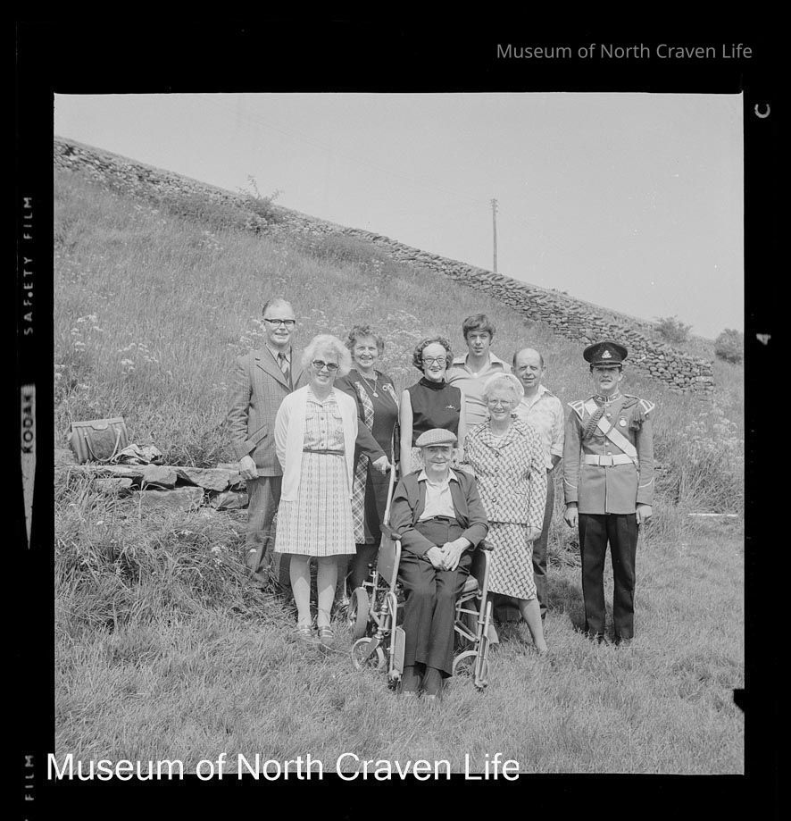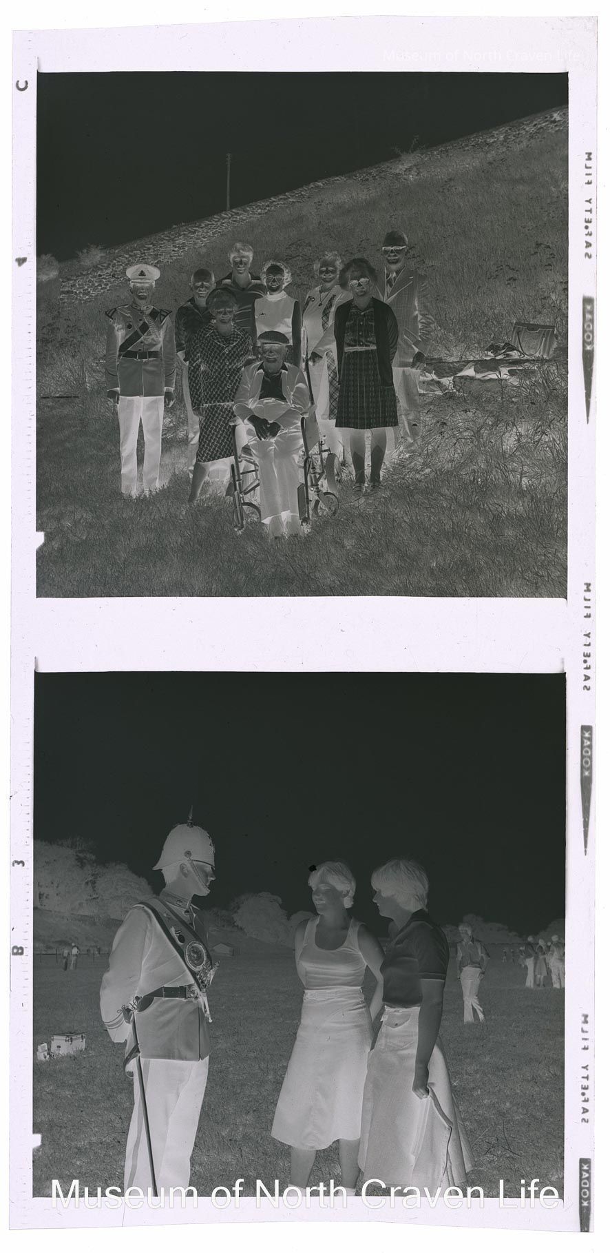 A 2¼" gelatin silver monochrome film negative. A group portrait of a soldier with civilian men and women at the Duke of Wellington Tattoo in Settle. A man is seated in a wheelchair in the foregroundCollection