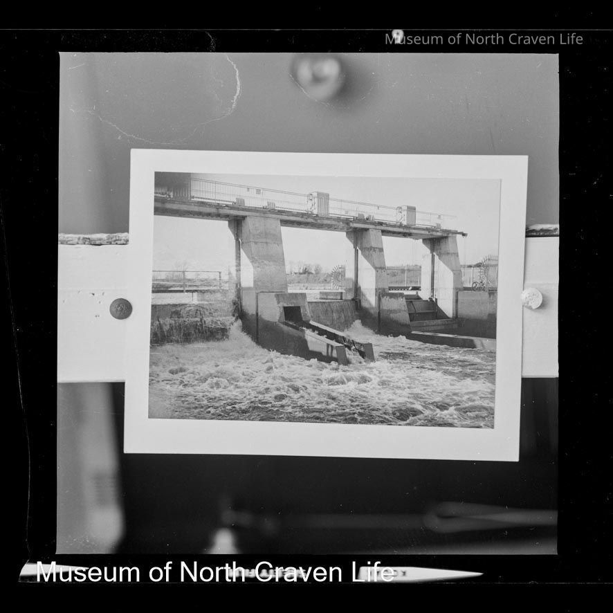 A 2½ x 2½" monochrome acetate film negative. A view of locks with fast flowing waterCollection