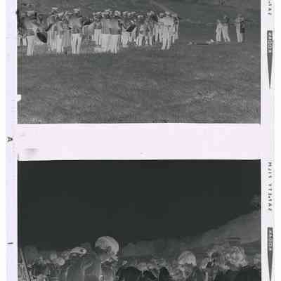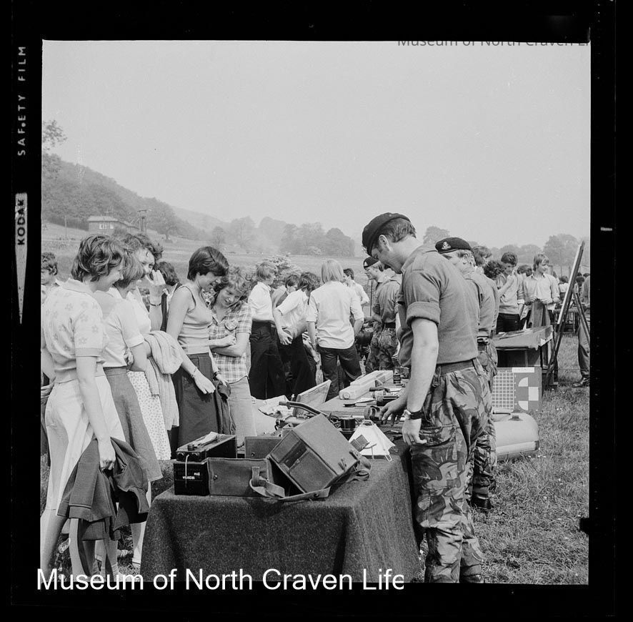 A 2¼" gelatin silver monochrome film negative. A group portrait of people at a stall with soldiers in uniform at the Duke of Wellington Tattoo in SettleCollection