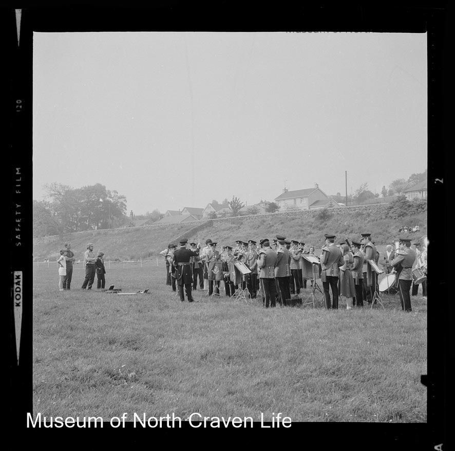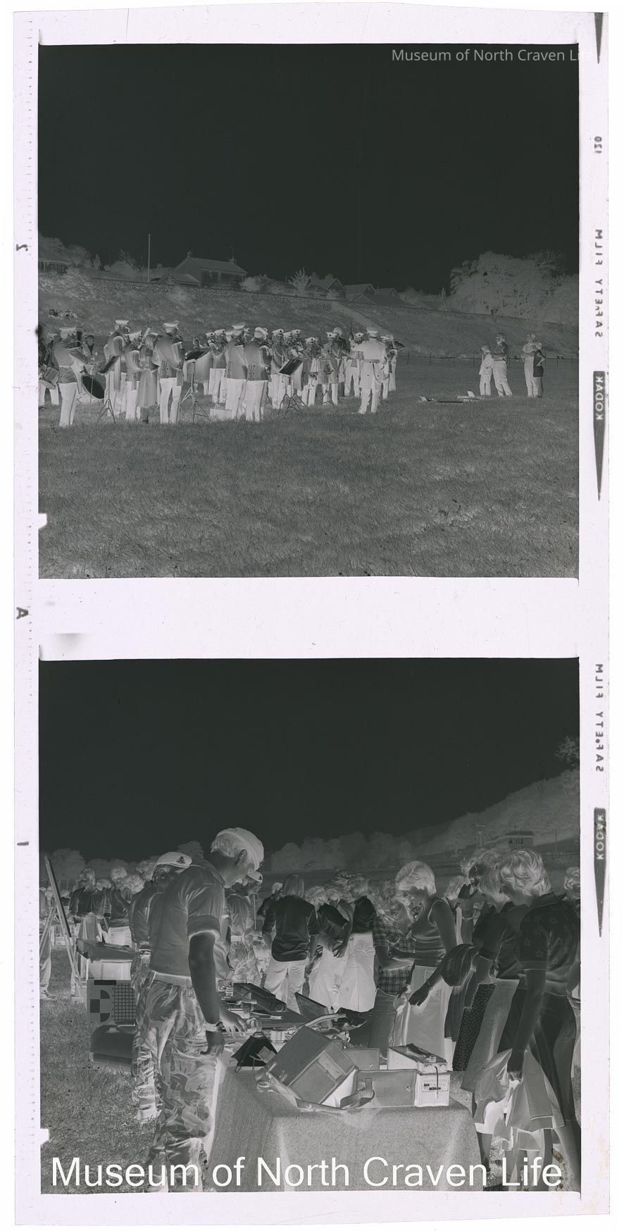 A 2¼" gelatin silver monochrome film negative. A group portrait of a military band in uniform at the Duke of Wellington Tattoo in SettleCollection