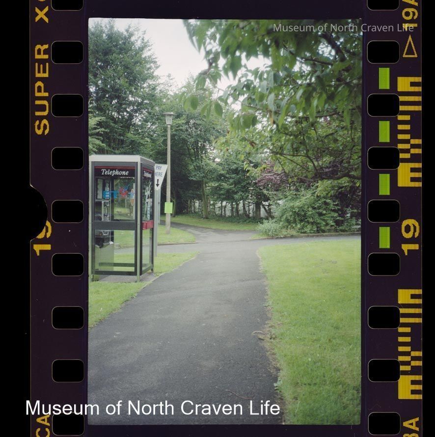 A 35mm colour film negative. A view of Greenfoot Car Park gardens in Settle with a phonebox. 1990sCollection