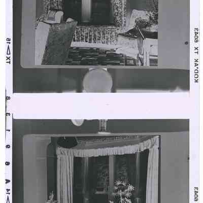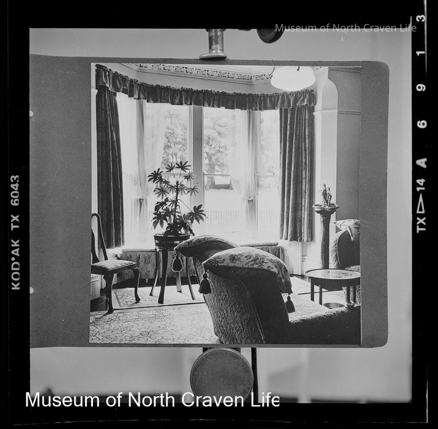 A 2¼" monochrome acetate film negative. A view of a parlour with bay window and plant (Skidmore). 1985Collection